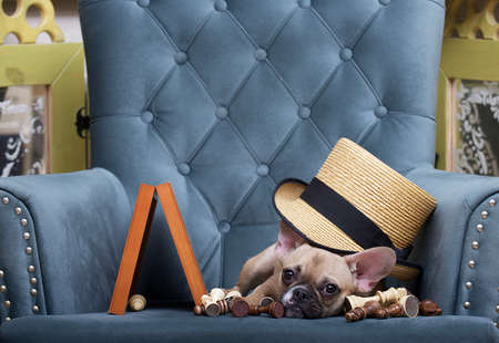 A bulldog dog lies next to an overturned chessboard on a cozy armchair in the living room among scattered chess pieces. French bulldog looks away frustratedly lying under a stylish straw hat.
