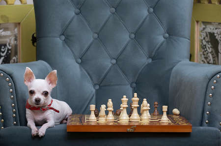 Chihuahua dog plays chess sitting in a cozy armchair at the chessboard and carefully looks into the camera. The little white chihuahua is passionate about the game.