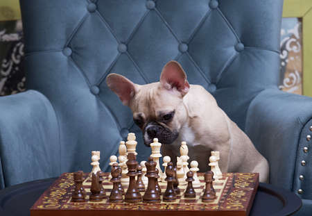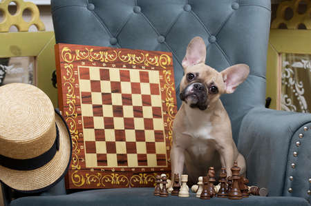 A small French bulldog dog sits at the blue vintage armchair with chessboard, with wooden chess pieces are placed and waits for the partner. A small funny dog looks into the camera attentively.