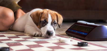 jack russell terrier puppy watching plays checkers, horizontal