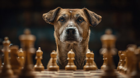 focused dog stares intently at a chessboard, as if contemplating its next move, creating a humorous and intelligent animal portrait.