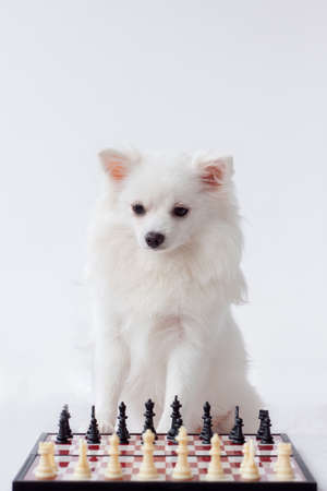 Close up of beautiful white spitz with chess pieces on chessboard. Cute dog playing chess on black background