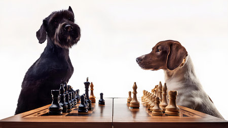 two dogs french bulldog and schnauzer play chess like people