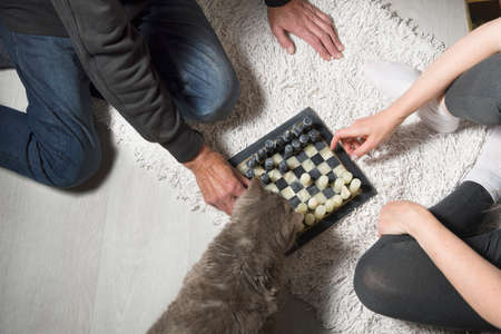 A married couple a man and a woman are playing chess on the carpet, and a gray cat is watching the game, evening games at home with the family
