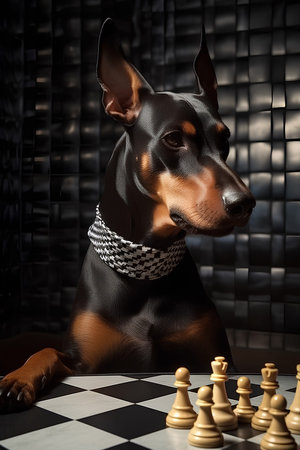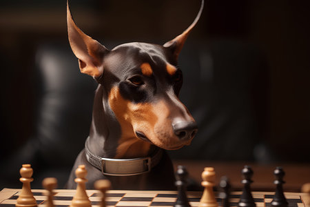 Portrait of Doberman in front of checkerboard board with chessmen on dark background.