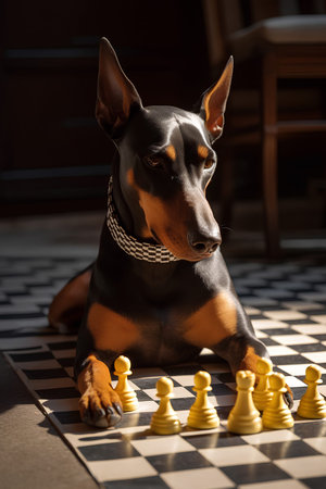 Portrait of Doberman laying on the checkerboard floor with chessmen