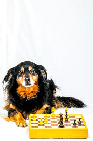 Russian Spaniel dog and chess in dark interior studio