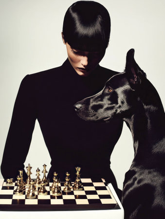 A pensive woman in a black outfit plays chess with a Great Dane, surrounded by a dramatic contrast of light and shadow, symbolizing strategy and companionship