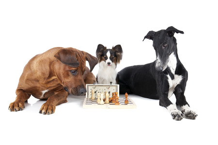 Rottweiler and Labrador are playing chess on a white background.