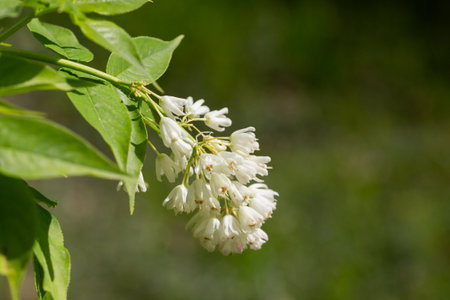 A close up shot of bell-shaped, fragrant buds and flowers of the Staphylea Pinnata amid green leaves spring flower background