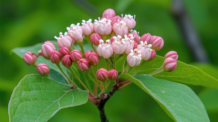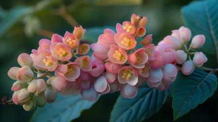 Close-up image showcases a cluster of small, delicate pink and white flowers in various stages of bloom, nestled amongst lush green leaves. The image highlights the intricate details of the flowers and their soft colors against the backdrop of a blurred green natural environment.