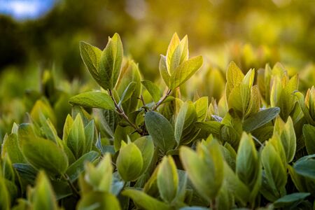 Morning golden rays of light over young spring leaves. Green bush.