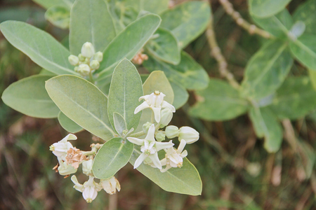 Stock photo of white color giant calotrope plant also known as calotropis gigantea, crown flower. It has been traditionally used for stomach ulcers, diarrhea, constipation, jaundice. selective focus.