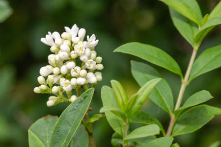 Ligustrum vulgare wild european privet white flowering plant, group of scented flowers in bloom on shrub branches, green leaves.