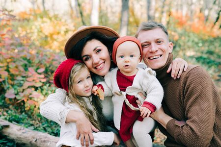Beautiful young family with small children on a walk in autumn forest.