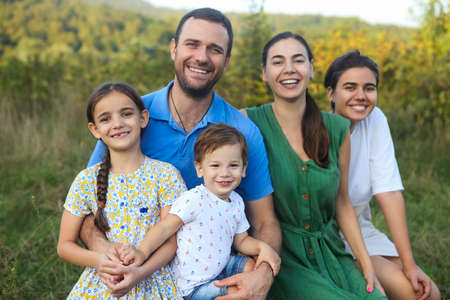 Portrait of the big happy family. Parents with children in countryside outdoors