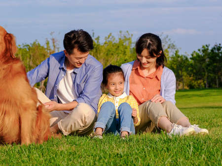 Happy family of three and pet dog in the park high quality photo