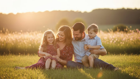 A family of four sits in a grassy field, bathed in warm sunlight. The image features a man, woman, a young girl, and a toddler. The composition includes vibrant greens and yellows, suggesting a natural outdoor setting. This photo may be suitable for illustrating family, happiness, or lifestyle concepts in various media.
