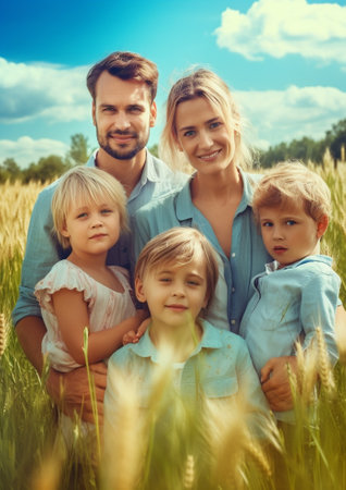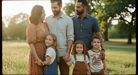 A family portrait in a sunlit field, featuring two adults and three children, smiling and holding hands, with a warm, joyful atmosphere