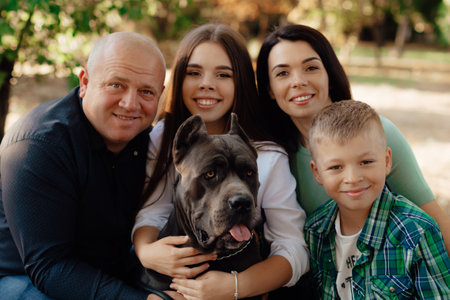Happy big family with labrador retriever dog playing in park. Love and affection for pets, friendship companion. Dog breed - Cane Corso