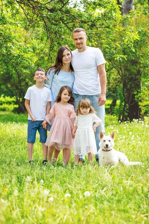 Happy beautiful big family together mother, father, children and dog walking on a Sunny summer day