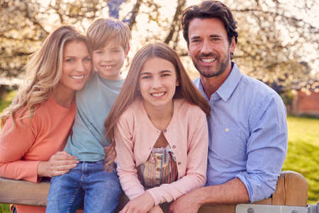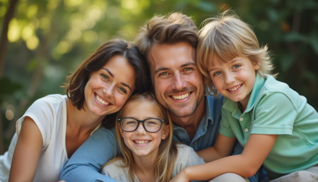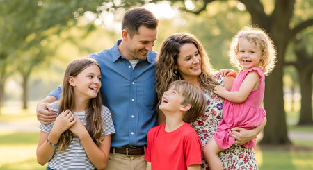 A family of four is captured in an outdoor setting, smiling and interacting. The composition features soft lighting and warm tones, possibly indicating a sunny day. This image could be suitable for various uses, including family-themed advertising or editorial content, emphasizing togetherness and happiness.