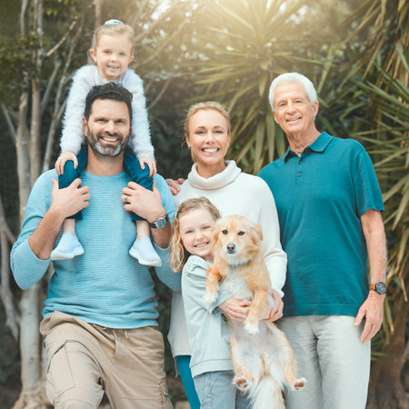 Happy family of four generations smiling and posing together in a park, enjoying quality time on a sunny day