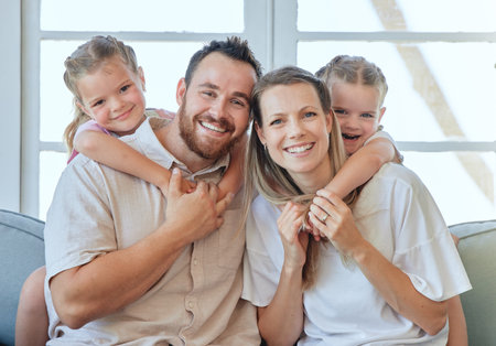 People, hug and parents with children in portrait, happiness and together in new home living room. People, bonding or love with care, mother and father relax with kids on dream home couch or lounge