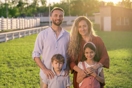 Happy young contemporary family of father, mother, daughter and son standing on green lawn