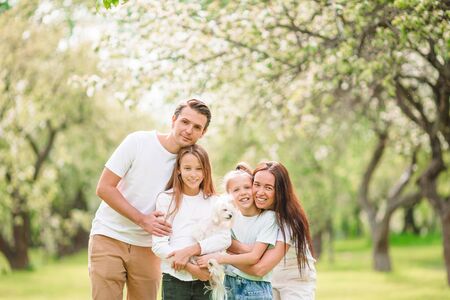 Happy family of four and pet dog in outdoor photo high quality photo