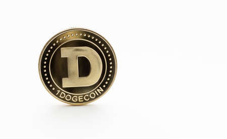 Digital currency physical golden dogecoin coin isolated on white background.