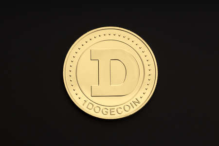Dogecoin crypto currency on black background close-up view, one golden coin, business and finance concept photo