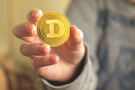 Dogecoin crypto currency in hand close-up business background