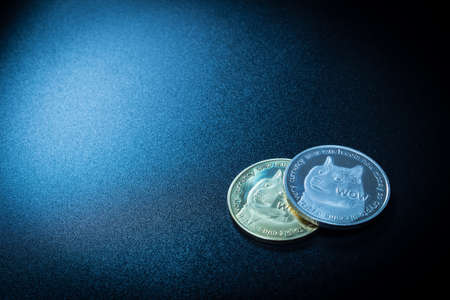 Cryptocurrency Dogecoin on table and digital currency money concept