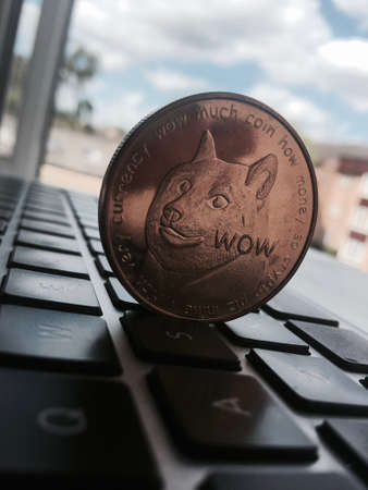 Digital currency physical brass dogecoin coin on the black computer keyboard near window.