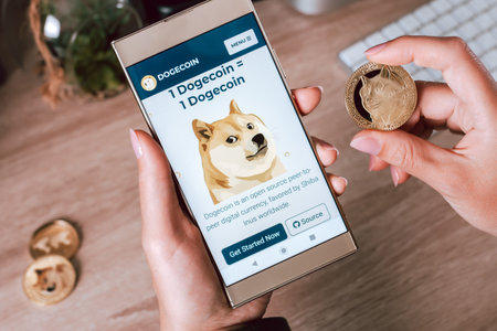 Empuriabrava, Spain, June 2021 - Woman holding Dogecoin token and smartphone with Dogecoin website on background of work desk