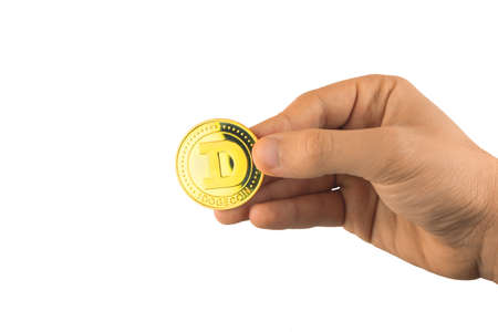 One golden dogecoin in hand isolated on white background, cryptocurrency payments concept