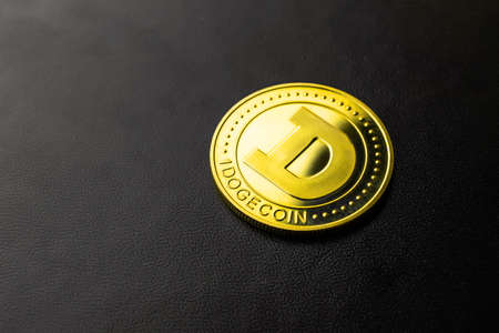 Dogecoin crypto currency on black background close-up view, one golden coin, business and finance concept photo
