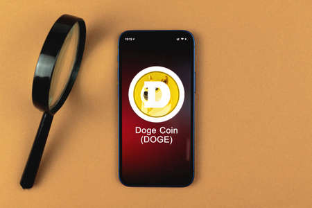Dogecoin gold coin. Cryptocurrency and business chart in a cellphone.