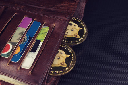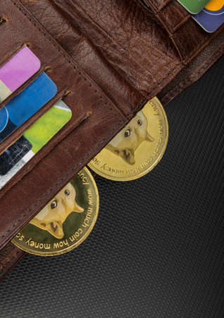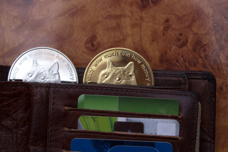 Dogecoins in a wallet over dark surface