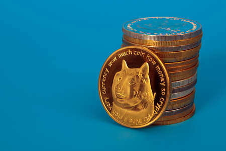 Stack of dogecoins over blue background