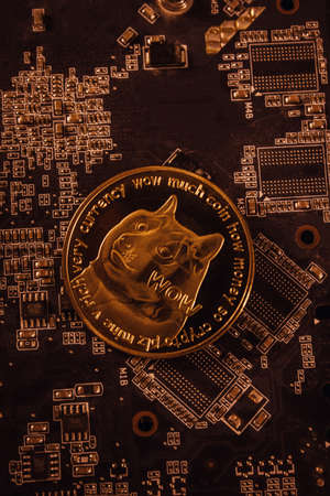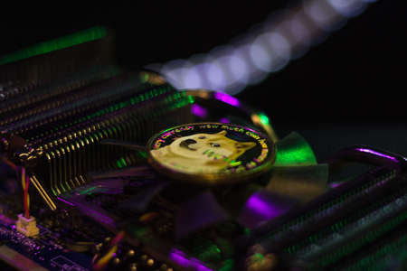 Dogecoin on graphic videocard in soft light