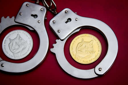 Dogecoins and handcuffs over red background