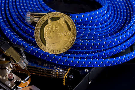 New cryptocurrency Dogecoin on a mining a virtual currency for using computer hard disk drives