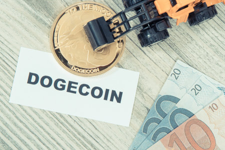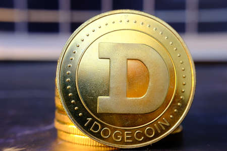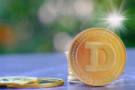 Cryptocurrency Dogecoin on table and digital currency money concept