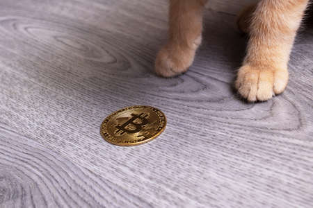 Ginger kitten holding bitcoin close up on wooden floor background