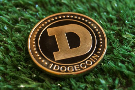 Close-up photo of the Dogecoin crypto currency with the background out of focus