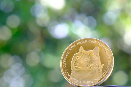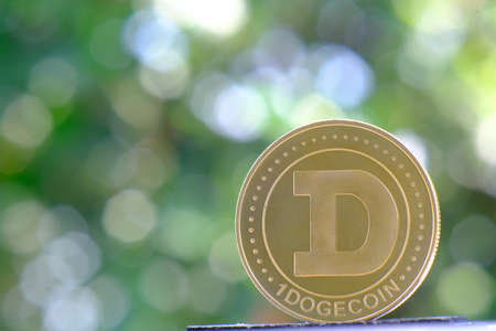 Digital currency physical brass dogecoin coin in green natural background.