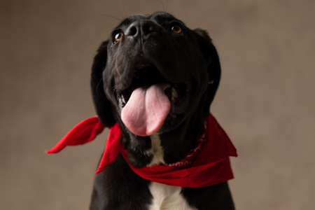 adorable cane corso dog panting and sticking out tongue while looking up and asking for food on brown background in studio