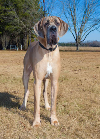 A purebred Great Dane dog without leash outdoors in the nature on a sunny day.